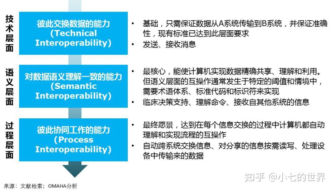 美国健康和人类服务部(Health and Human Services,HHS)秘书处的官方咨询组织国家生命和健康统计委员会(National Committee on Vital and Health Statistics,NCVHS)曾在2000年将健康医疗信息技术的互操作能力进行了三个等级的划分,分别是:基础级别、结构级别和语义级别。HIMSS目前也推崇并采纳这个分类: