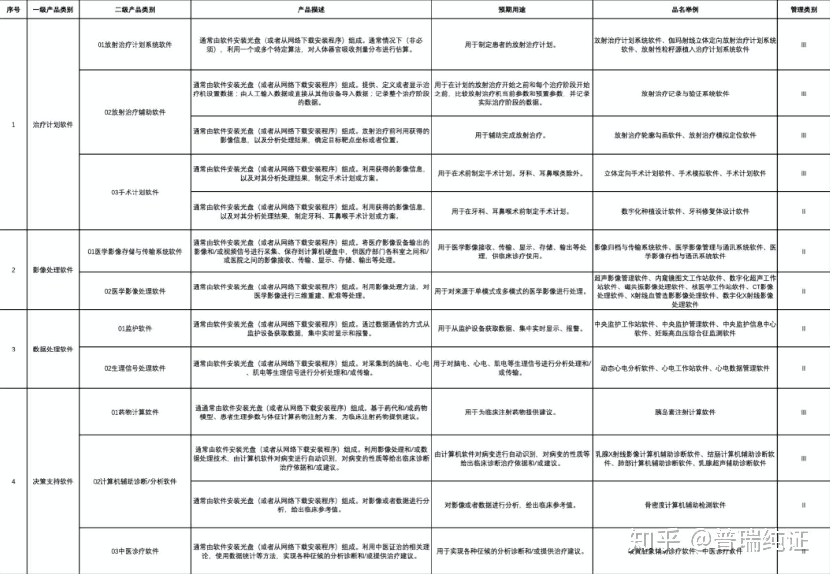 NMPA将独立软件分为II类和III类,按照预期用途分为辅助诊断类和治疗类,按照处理对象,可以分为“影像”、“数据”、“影像和数据”三种情况。根据《医疗器械分类目录的公告》,医用软件分为6个一级产品类别,13个二级产品类别,并列举51个品名举例。
