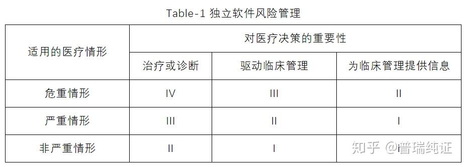 基于对用户行动影响程度可分为治疗或诊断、驱动临床管理和为临床管理提供信息三大类;基于软件使用医疗情形可分为危重情形、严重情形和非严重情形。