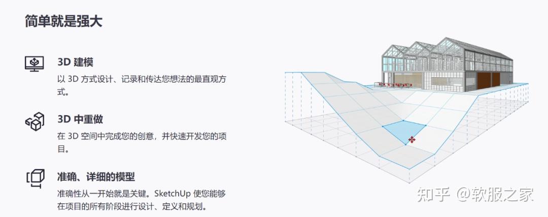 SketchUp是一个受欢迎且易于使用的3D设计软件,官方网站将它比喻作电子设计中的“铅笔”。它的主要特点就是使用简便,人人都可以快速上手。在SketchUp中创建三维模型就像使用铅笔在图纸上作图一般。