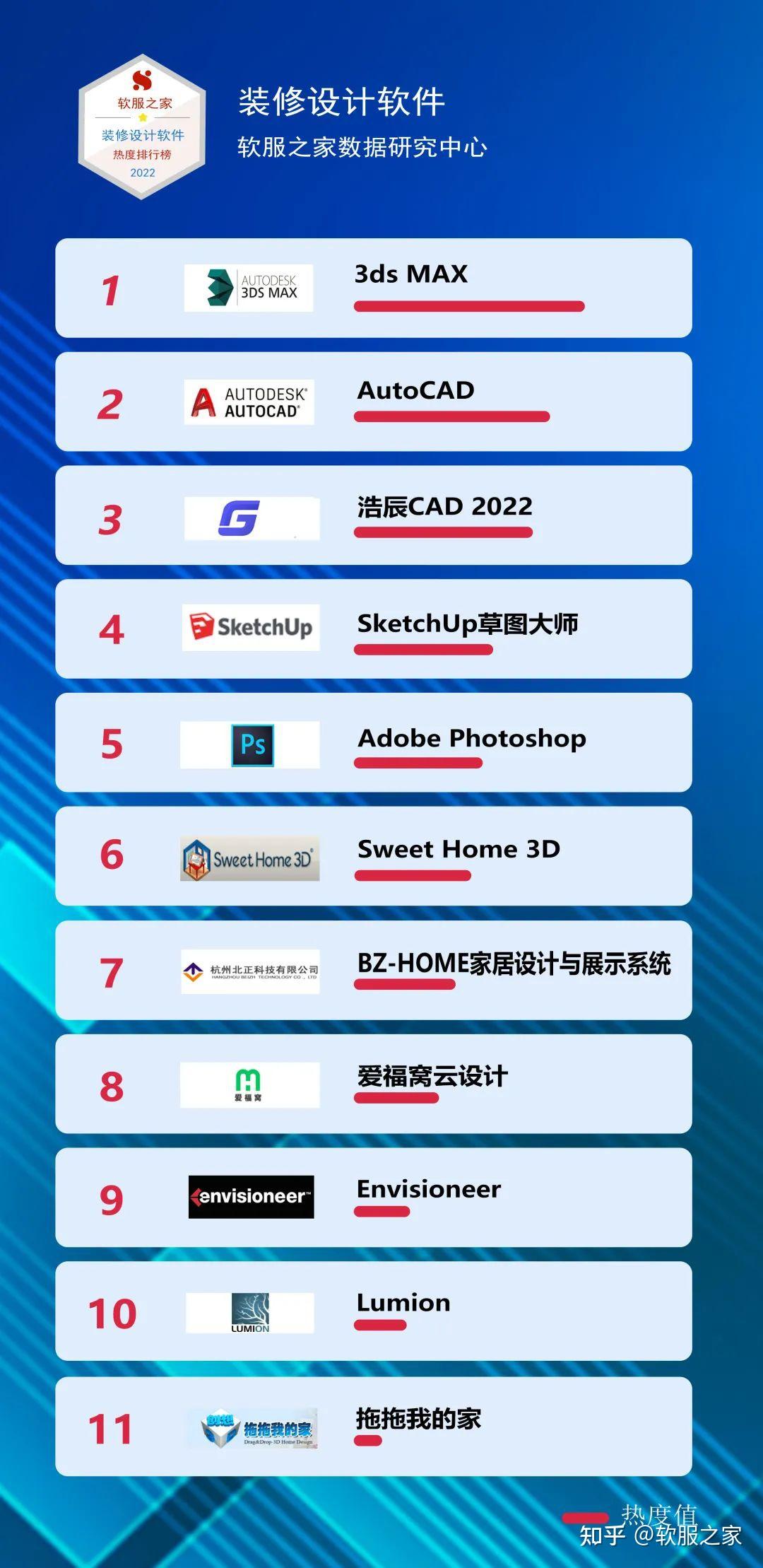 导读:装修设计软件常用到的有:3dmax、CAD、ps、Sketchup等,渲染较好的软件有vray,Lightscape等。3dmax是专业的设计软件,在广告、影视、工业设计、建筑设计会使用到,早期被用在三维动画渲染比较多。CAD软件主要是平面绘图,能以多种方式创建直线、圆、椭圆、圆环多边形、样条曲线等基本图形对象。软服之家为你提供2022装修设计软件最新的排名!